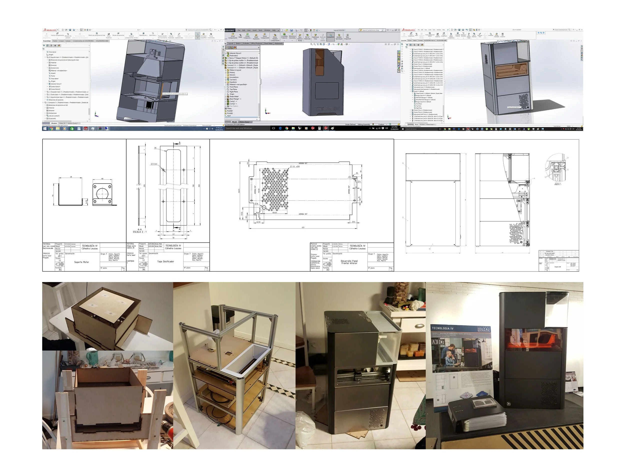 Collage of images showing CAD design sketches, 3D renderings, and assembly photos of a small rectangular electronic device or cabinet, with components, internal structure, and finished product.
