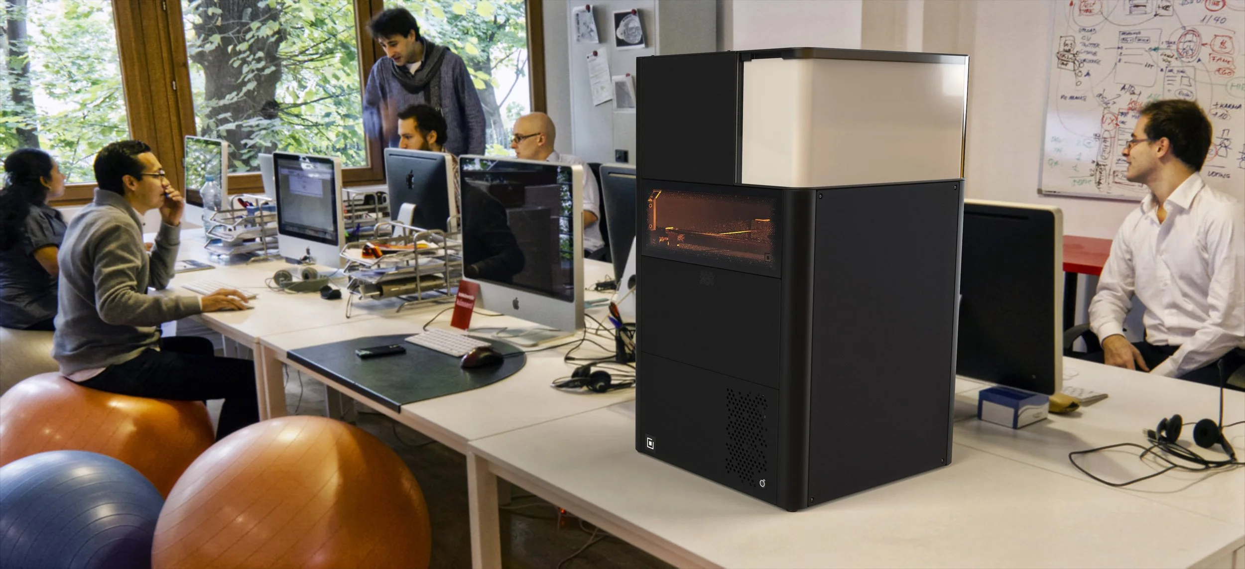 A group of people working in an office with desktop computers, with a large, black 3D printer or computer case in the foreground, and exercise balls on the floor.