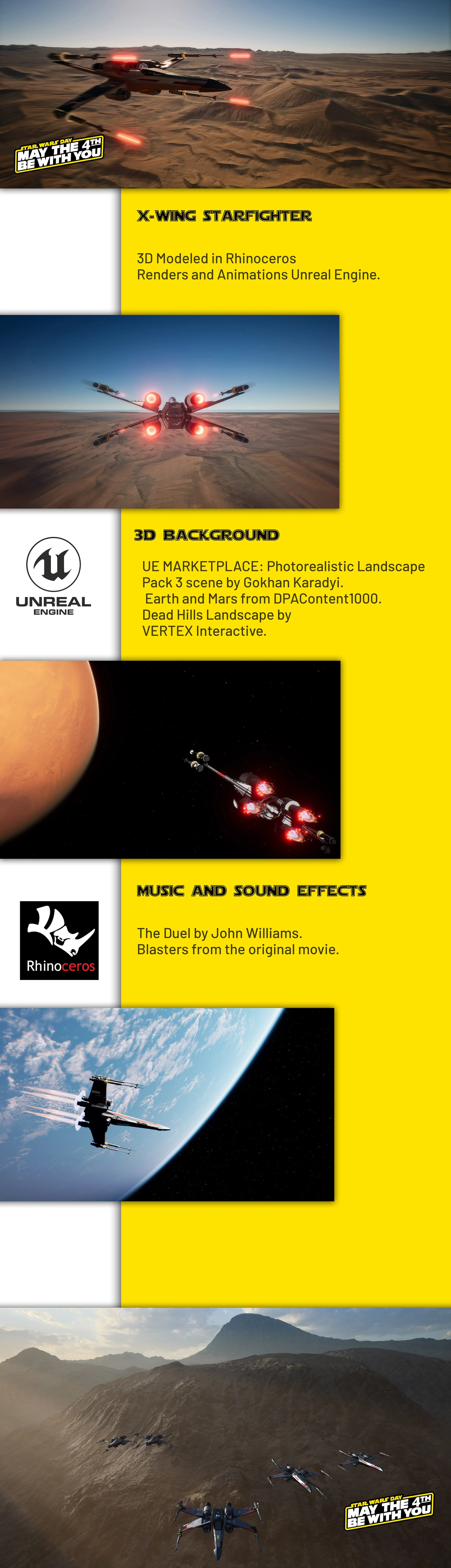 A digital collage featuring scenes from the Star Wars universe, including starfighter spaceships in space and over planets, with NASA branding and overlays of informational text about 3D modeling, backgrounds, sounds, and effects in Unreal Engine and RhinoCeros.